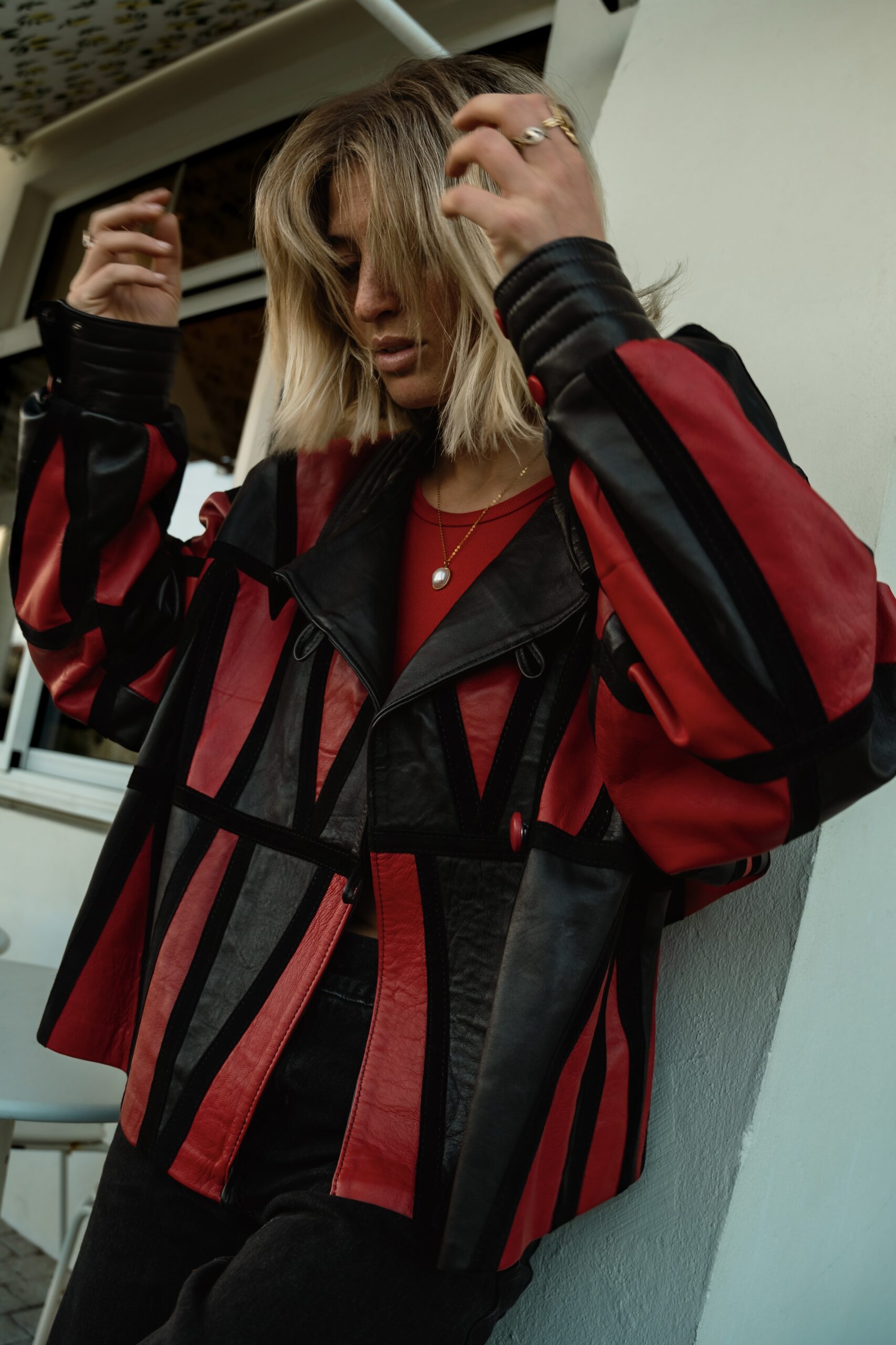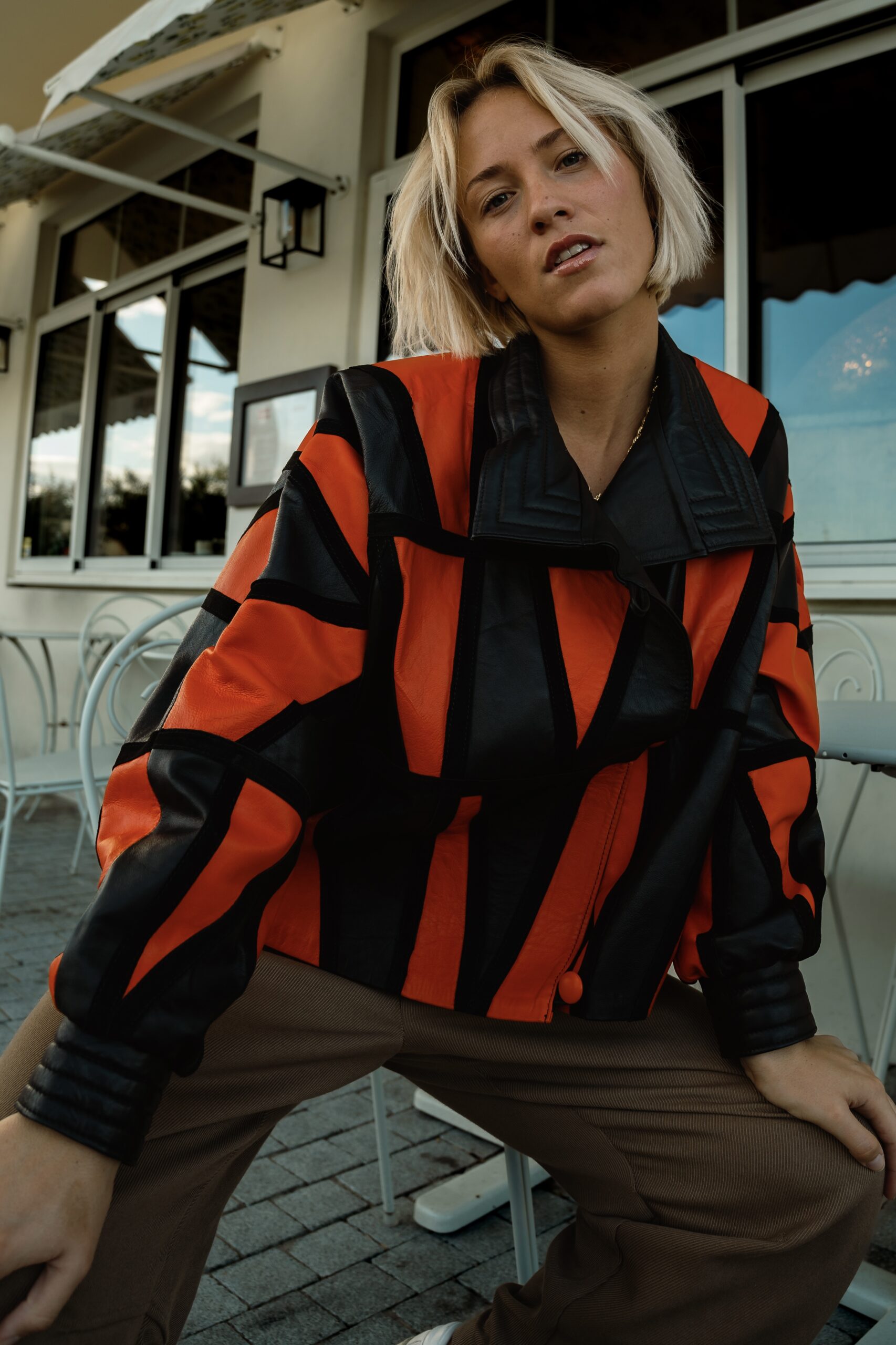 La veste en cuir courte agrémentée de patchwork, Cléo, issue de la collection Moon Women, est une pièce phare inspirée par les galaxies colorées et les nébuleuses cosmiques. Confectionnée en cuir orange et noir, en patchwork, cette veste se distingue par ses inserts de tissus multicolores et géométriques, créant un effet visuel saisissant et déconstruit. Chaque détail est minutieusement pensé, des coutures contrastantes aux découpes graphiques qui rappellent les formations stellaires.